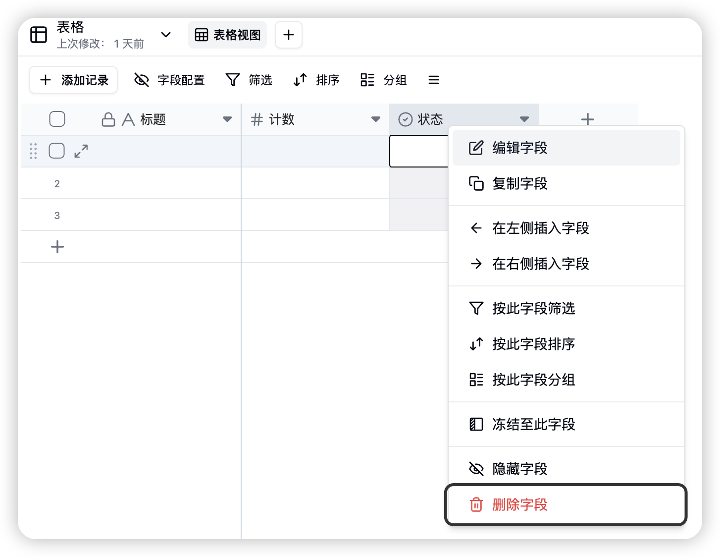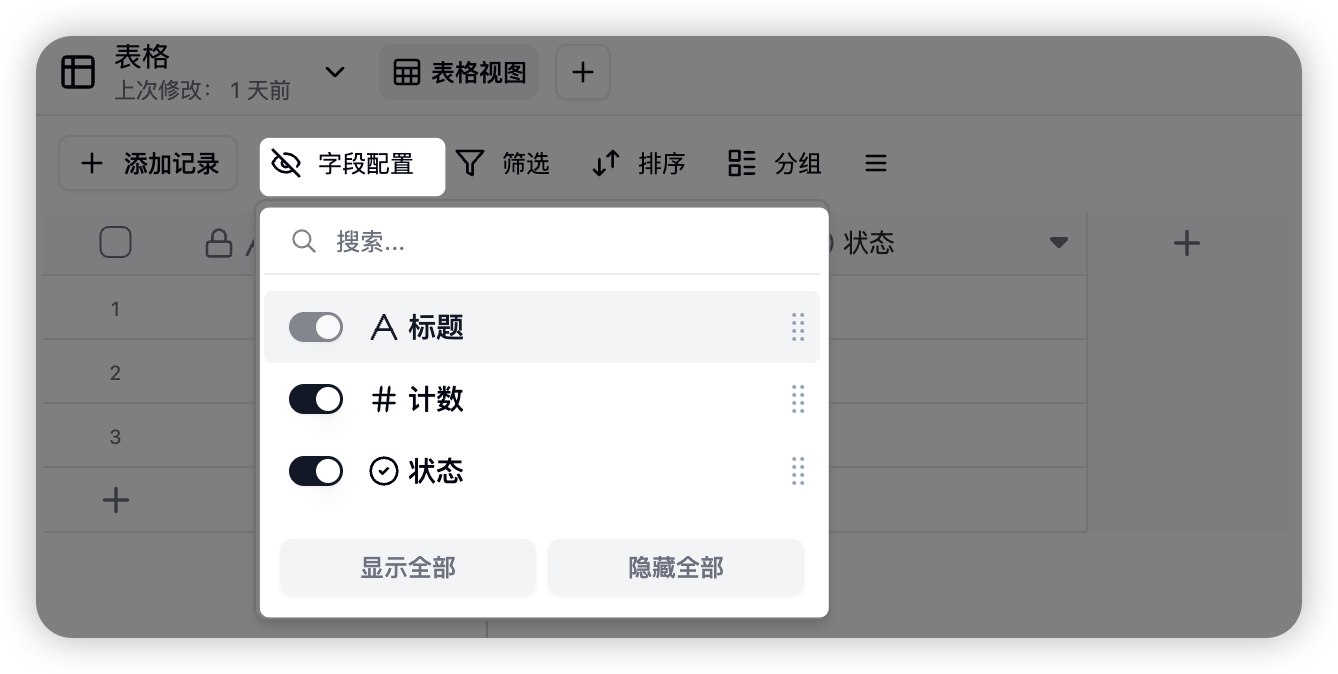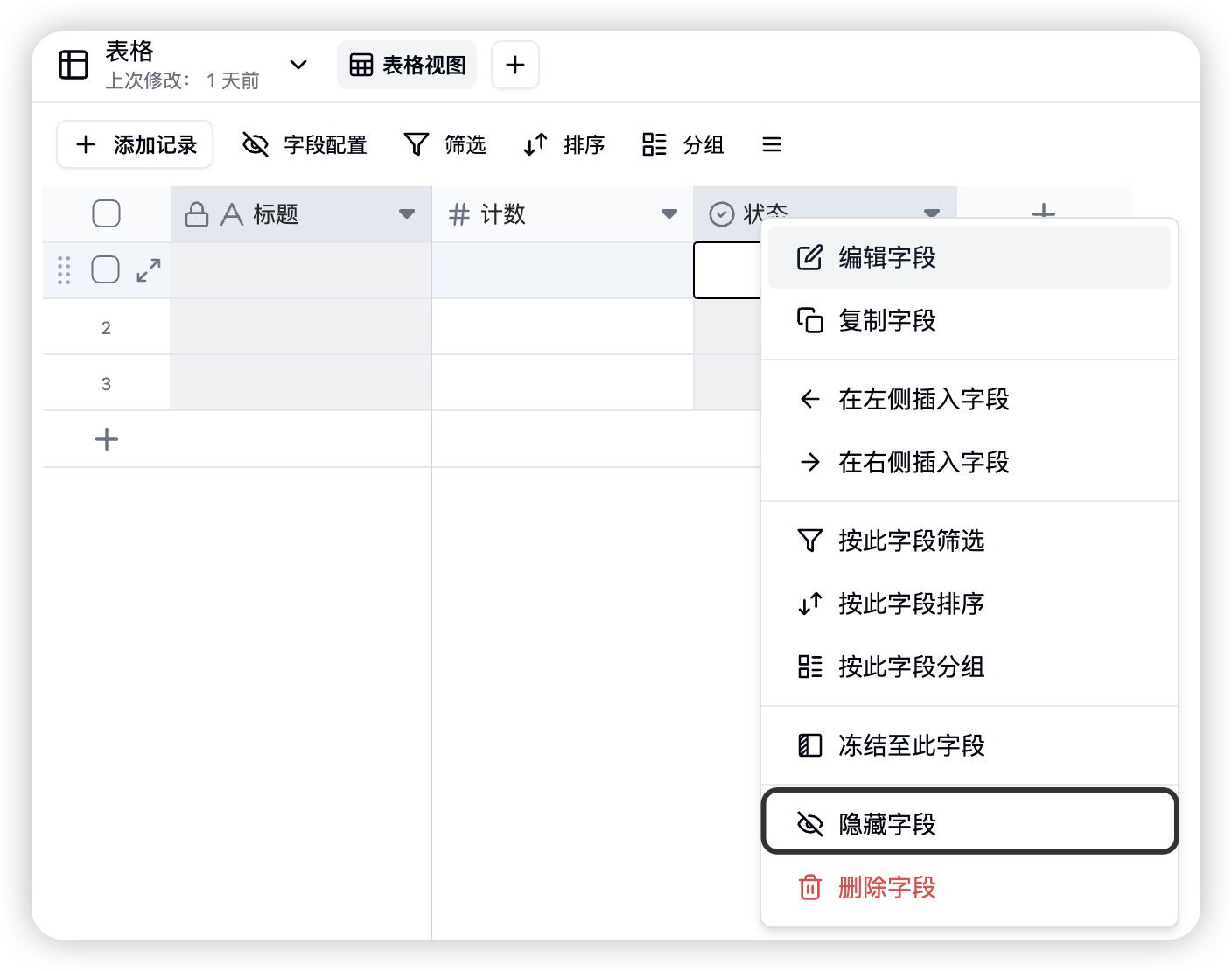 您可以通过字段的右键菜单或视图工具栏来隐藏字段。隐藏后的字段不会在表格视图中显示,但数据依然保留。-